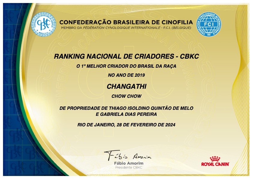 "Melhor criador do Brasil da raça Chow Chow do ano de 2019 - (Ranking Nacional de criadores - CBKC)"